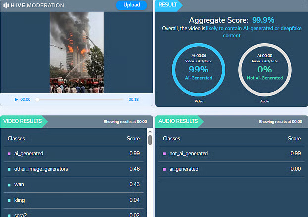 ভিডিওটি কৃত্রিম বুদ্ধিমত্তা দিয়ে তৈরি কি না, তা যাচাই করতে হাইভ মডারেশন (Hive Moderation) নামের এআই কনটেন্ট শনাক্তকারী প্ল্যাটফর্মে পরীক্ষা করা হয়। ফলাফলে দেখা যায়, ভিডিওটি এআই দ্বারা তৈরি হওয়ার সম্ভাবনা ৯৯ শতাংশ।